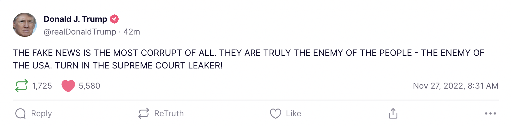 “THE FAKE NEWS IS THE MOST CORRUPT OF ALL. THEY ARE TRULY THE ENEMY OF THE PEOPLE – THE ENEMY OF THE USA. TURN IN THE SUPREME COURT LEAKER!” Trump wrote.