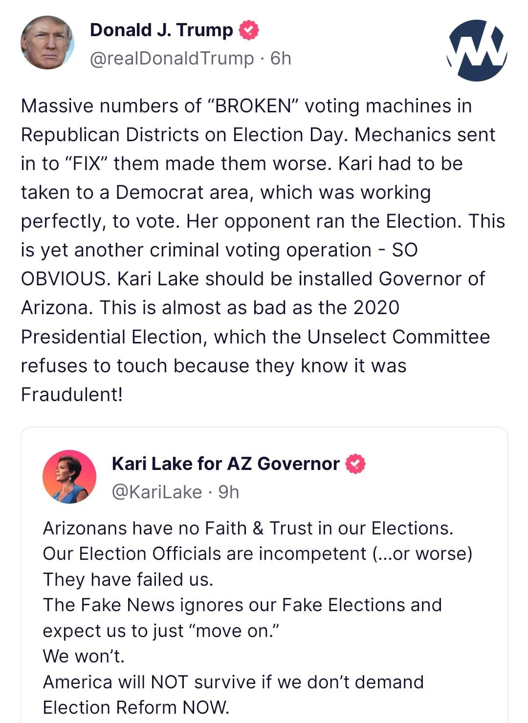 At 2:18 am Monday morning, Trump wrote on Truth Social: “Massive numbers of “BROKEN” voting machines in Republican Districts on Election Day. Mechanics sent in to “FIX” them made them worse. Kari had to be taken to a Democrat area, which was working perfectly, to vote. Her opponent ran the Election. This is yet another criminal voting operation – SO OBVIOUS. Kari Lake should be installed Governor of Arizona. This is almost as bad as the 2020 Presidential Election, which the Unselect Committee refuses to touch because they know it was Fraudulent!”