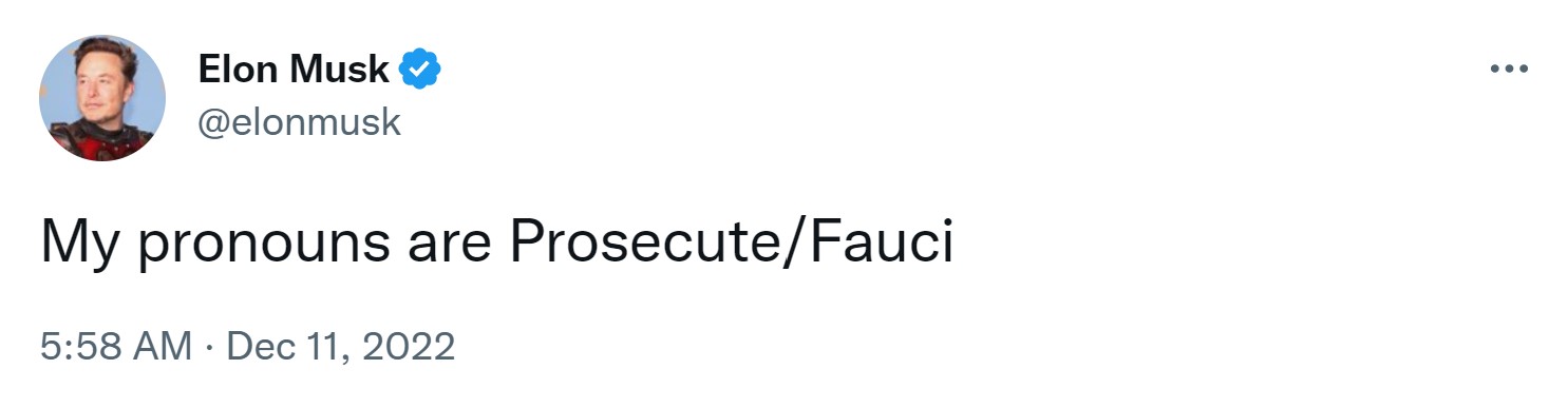 In an early-morning tweet on Sunday, Twitter owner Elon Musk took a swipe at outgoing White House chief medical advisor Dr. Anthony Fauci, writing, “My pronouns are Prosecute/Fauci.”