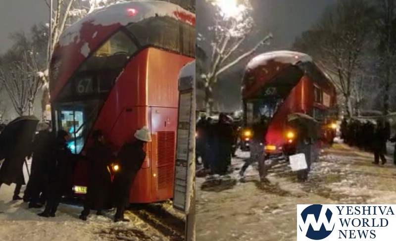 Along with snowstorms inevitably comes some mishaps. One such misadventure occurred near London, when one of the city’s famous double-decker red buses slid off a road and became stuck. But not to worry – a group of chasidim were there to help.