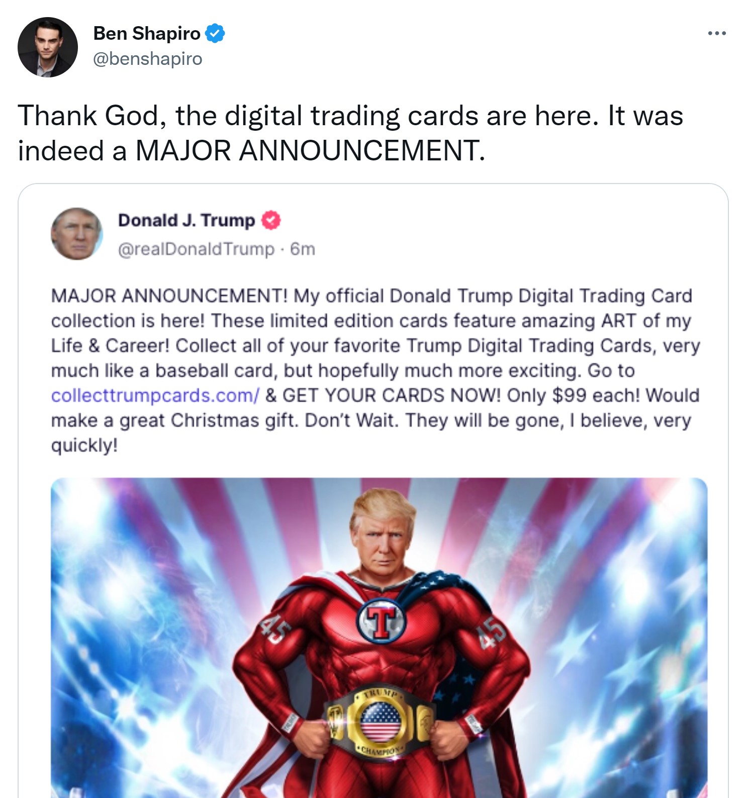 “Thank God, the digital trading cards are here. It was indeed a MAJOR ANNOUNCEMENT,” Ben Shapiro tweeted sarcastically.