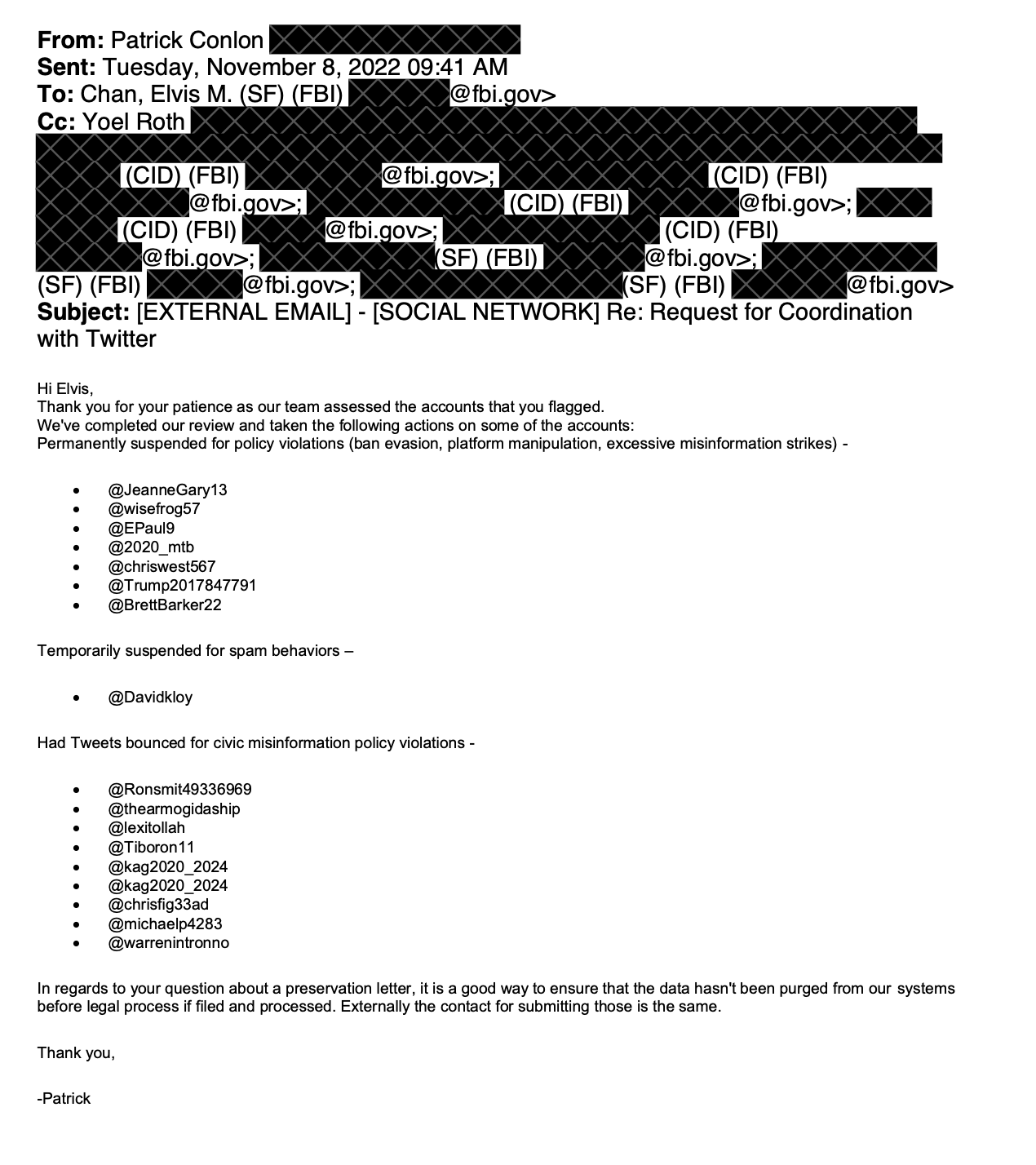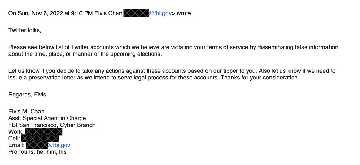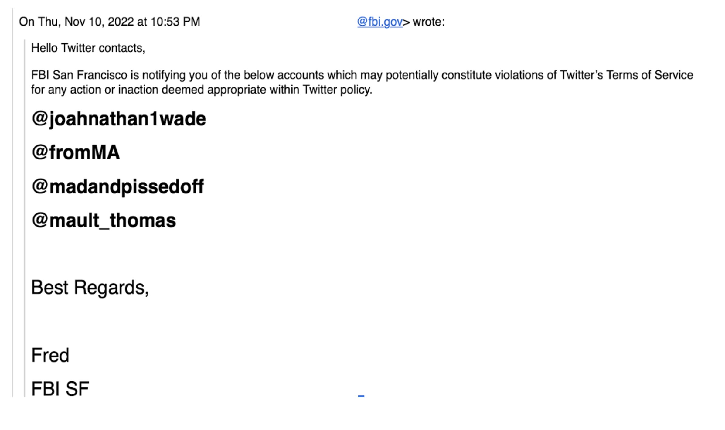 “HELLO TWITTER CONTACTS”: The master-canine quality of the FBI’s relationship to Twitter comes through in this November 2022 email, in which “FBI San Francisco is notifying you” it wants action on four accounts: