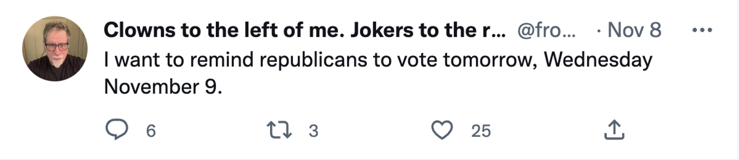 Twitter personnel in that case went on to look for reasons to suspend all four accounts, including @fromma, whose tweets are almost all jokes (see sample below), including his “civic misinformation” of Nov. 8: