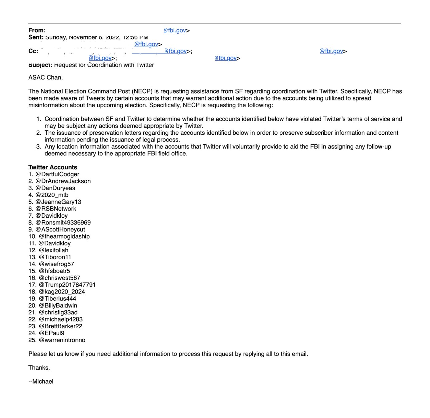 In an internal email from November 5, 2022, the FBI’s National Election Command Post, which compiles and sends on complaints, sent the SF field office a long list of accounts that “may warrant additional action”: