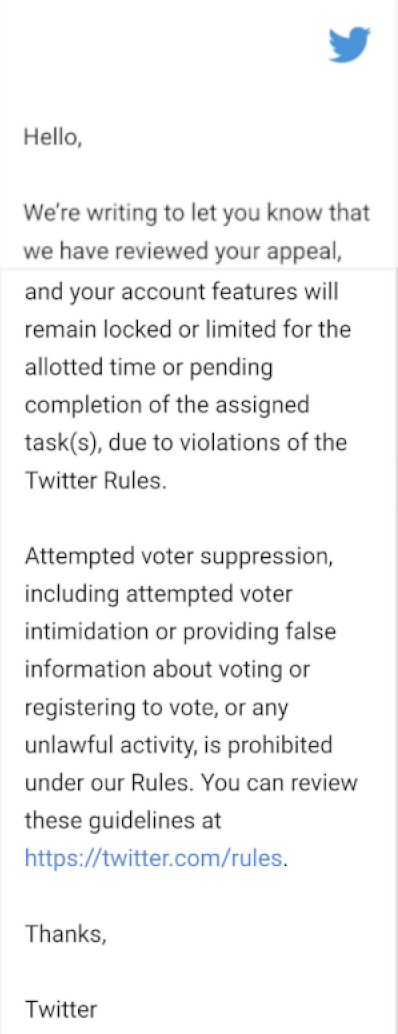 Many of the above accounts were satirical in nature, nearly all (with the exceptions of Baldwin and @RSBNetwork) were relatively low engagement, and some were suspended, most with a generic, “Thanks, Twitter” letter: