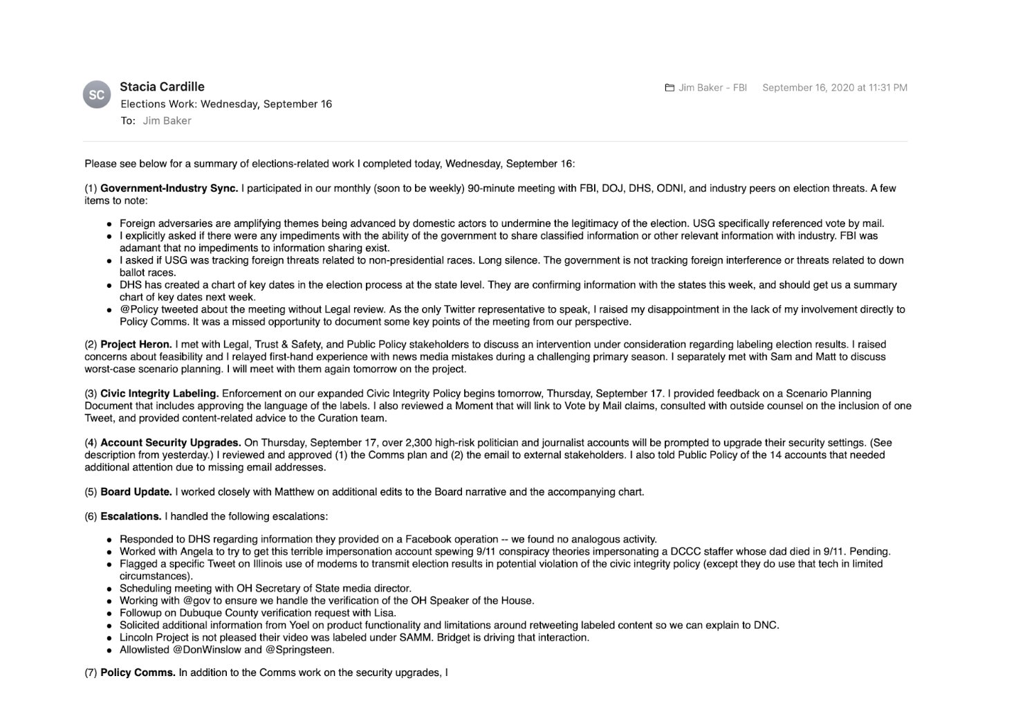 In a letter to former Deputy General Counsel (and former top FBI lawyer) Jim Baker on Sep. 16, 2022, legal exec Stacia Cardille outlines results from her “soon to be weekly” meeting with DHS, DOJ, FBI, and the Office of the Director of National Intelligence: