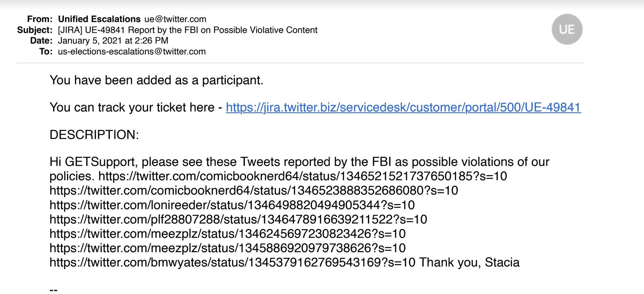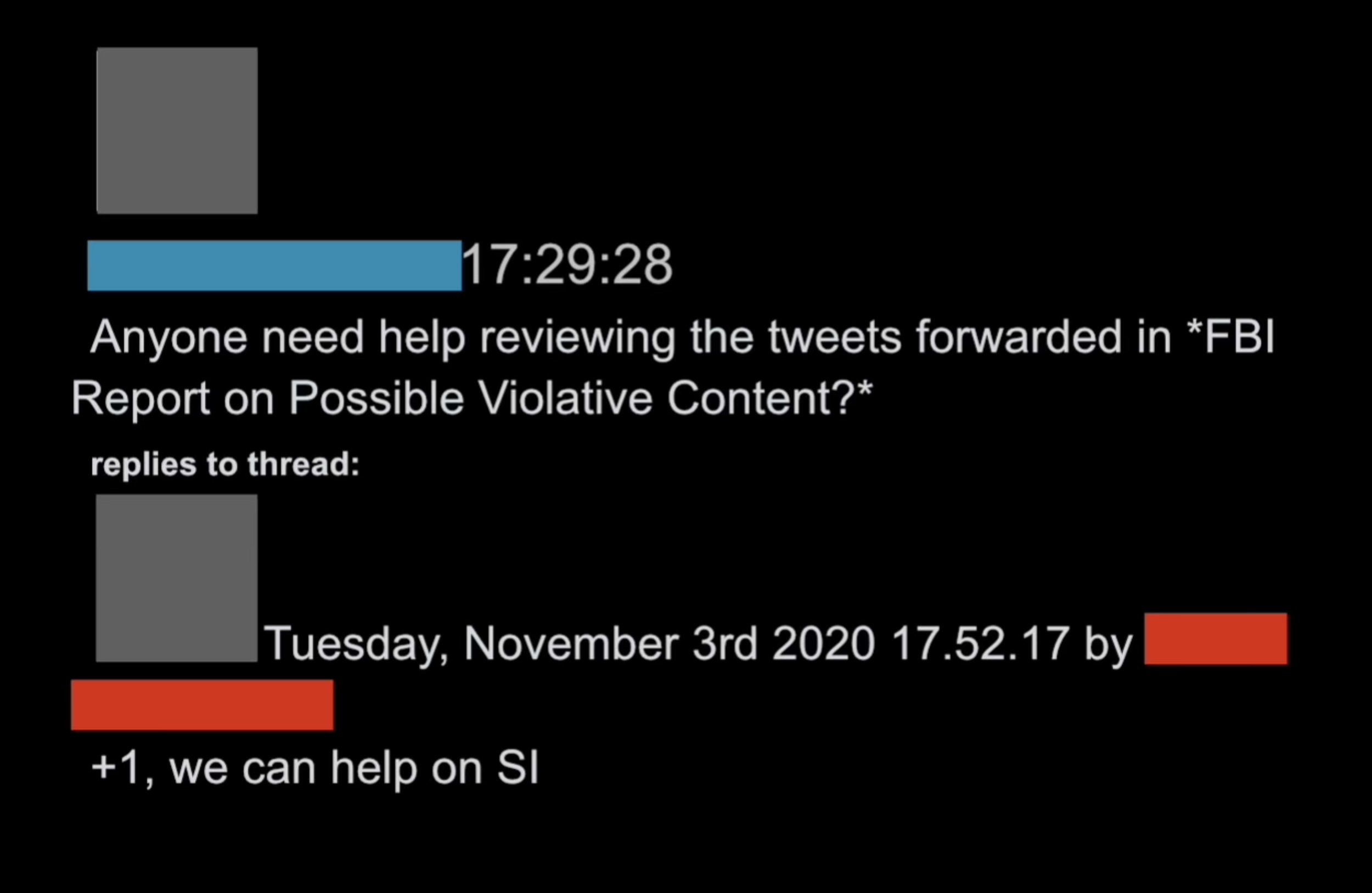 FBI in one case sent over so many “possible violative content” reports, Twitter personnel congratulated each other in Slack for the “monumental undertaking” of reviewing them: