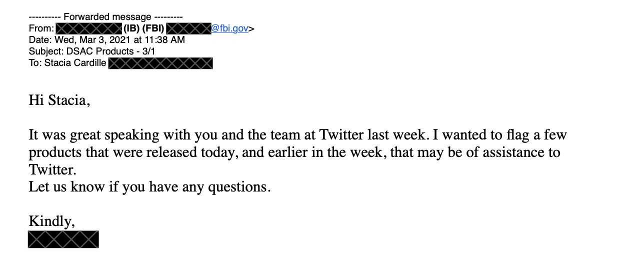 In this March, 2021 email, an FBI liaison thanks a senior Twitter exec for the chance to speak to “you and the team,” then delivers a packet of “products”: