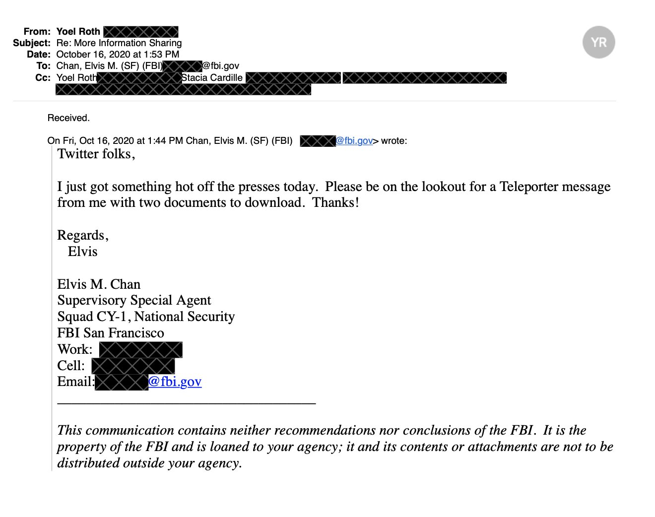 There were multiple points of entry into Twitter for government-flagged reports. This letter from Agent Chan to Roth references Teleporter, a platform through which Twitter could receive reports from the FBI: