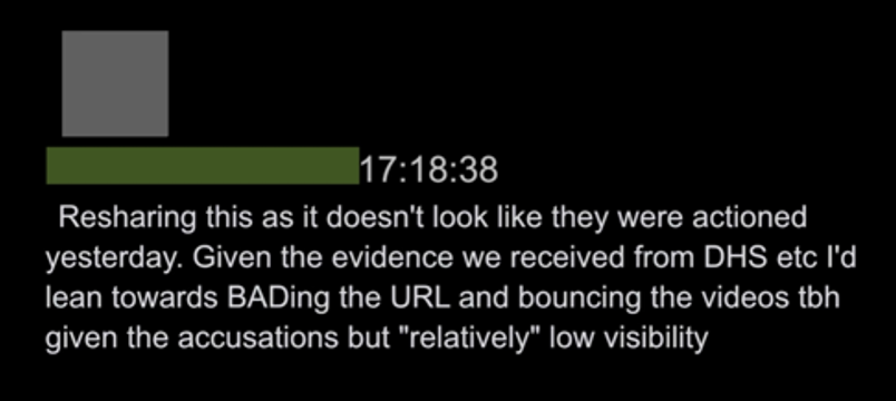 Reports also came from different agencies. Here, an employee recommends “bouncing” content based on evidence from “DHS etc”: