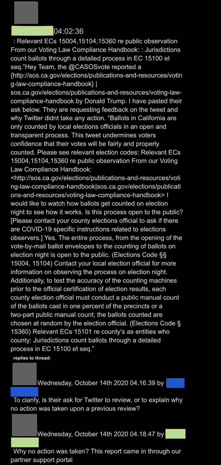 “WHY WAS NO ACTION TAKEN?” Below, Twitter execs – receiving an alert from California officials, by way of “our partner support portal” – debate whether to act on a Trump tweet: