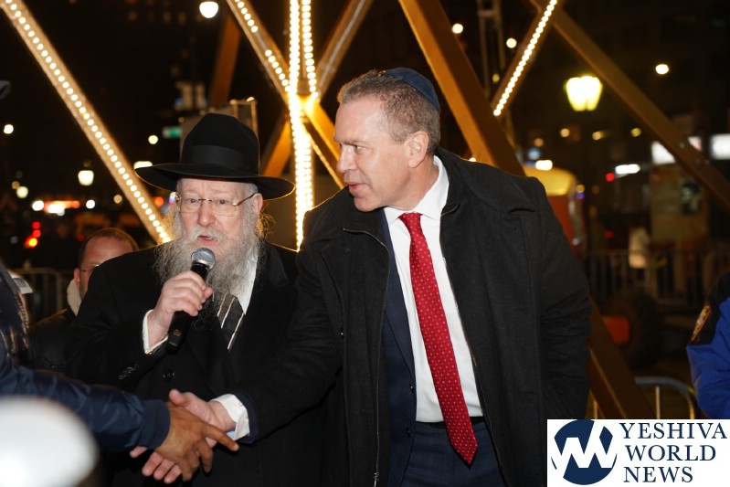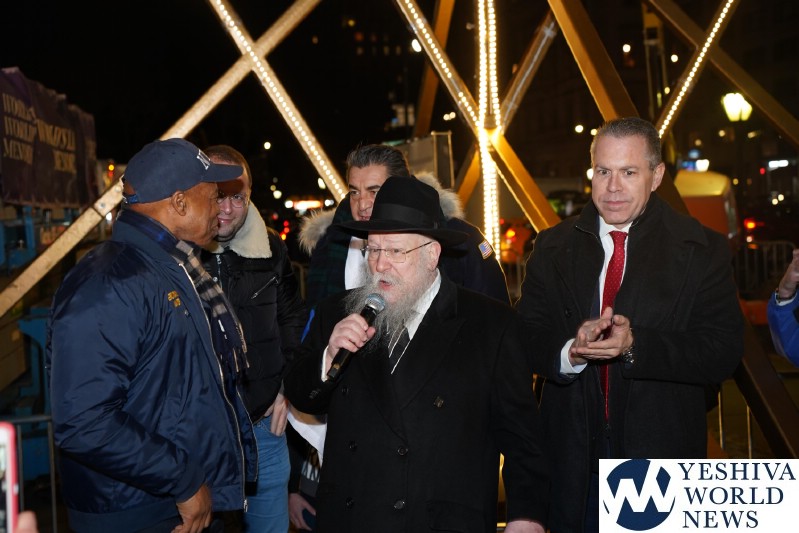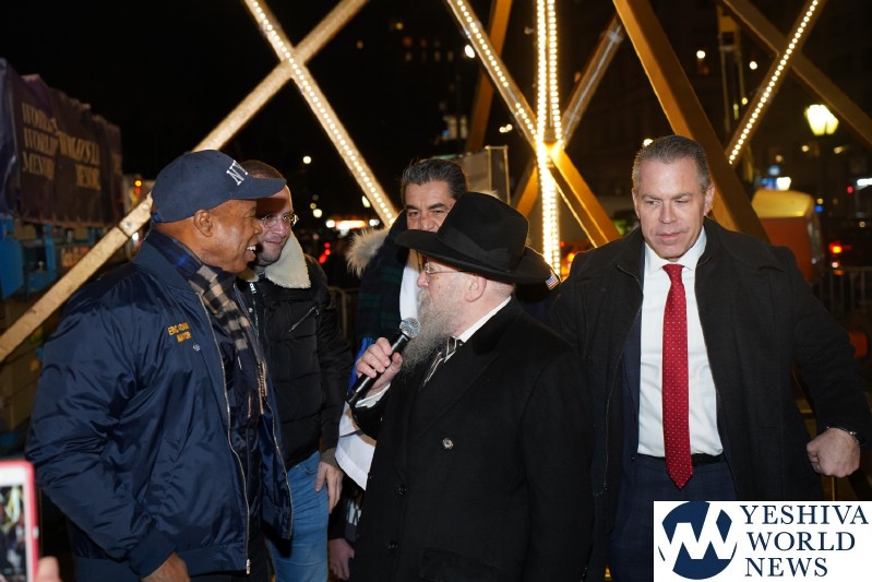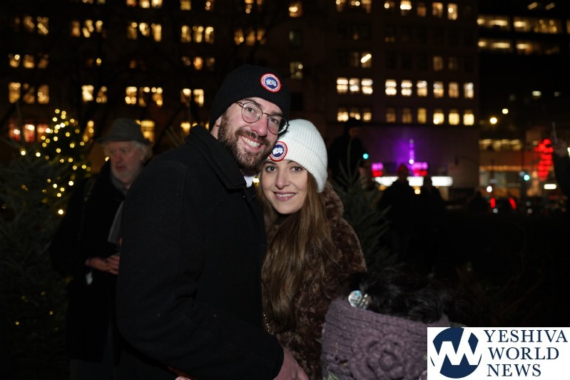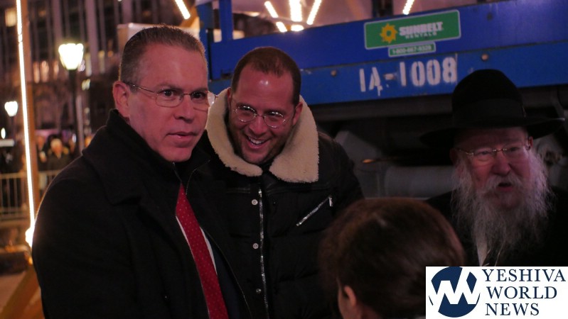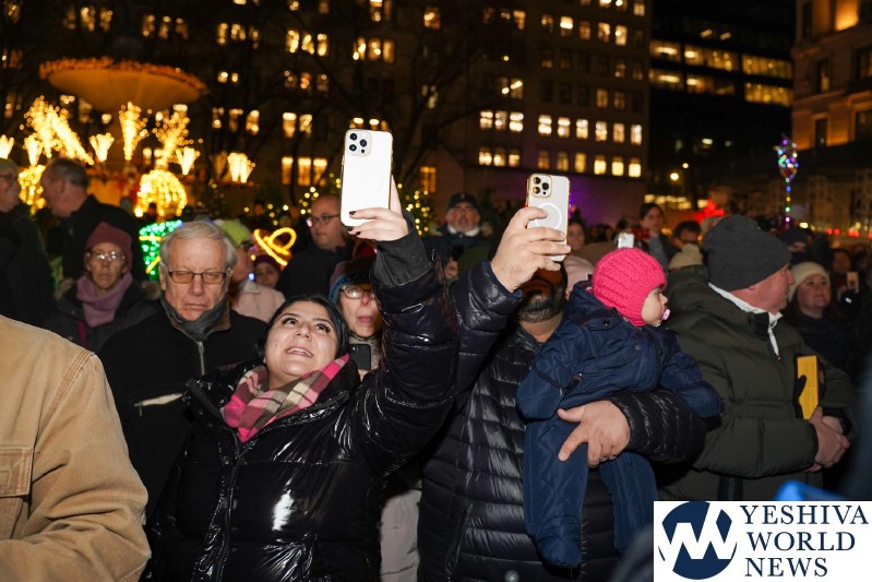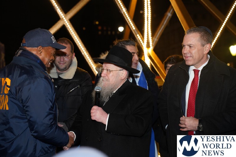 This year, on the first night, Mayor Eric Adams addressed the crowd, followed by Israel’s United Nations Ambassador Gilad Erdan who then recited the three Brachos on the first light of the menorah and lit the first candle. They were hosted by Rabbi Shmuel M. Butman, director of Lubavitch Youth Organization and joined by real estate developer Rotem Rosen.