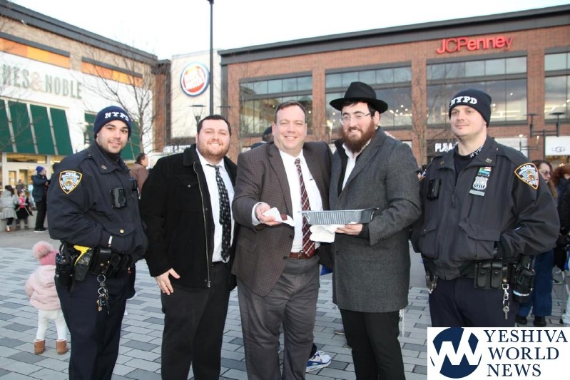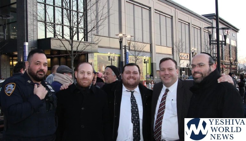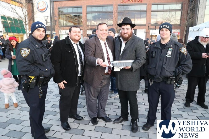 Assemblyman Michael Cusick was honored with lighting the Shames candle and while he was lighting the candle he was surrounded by John Rinaudo, representing Congress Member Nicole Malliotaki, Francesca Gallelli, representing District Attorney Michael McMahon together with Ari Weiss, COJO Security Chairman and Coordinator Staten Island Shomrim and with Officer Mike Frasca, Officer Tom Frasca, Officer Cynthia Janniere and Officer James Taylor.