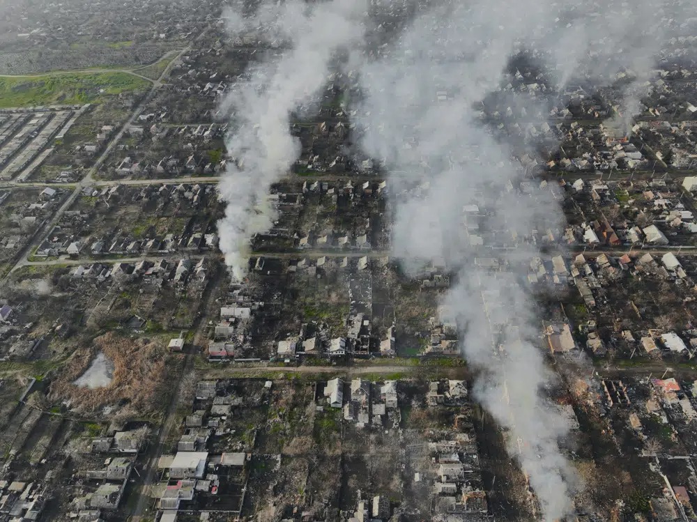 Smoke billows after Russian attacks in the outskirts of Bakhmut, Ukraine, Tuesday, Dec. 27, 2022. (AP Photo/Libkos)