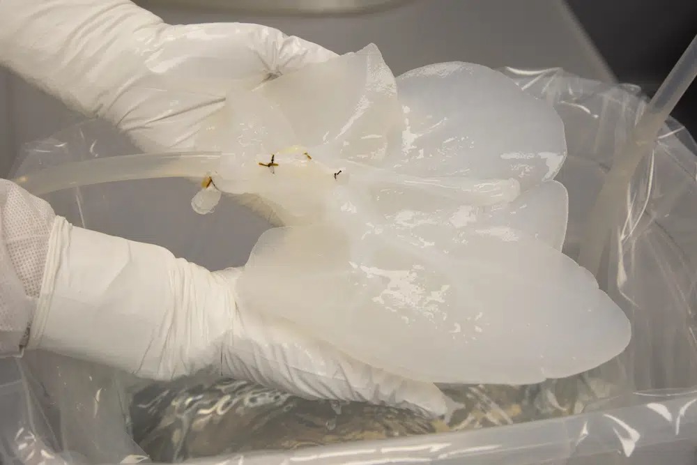 The first step for workers in this suburban Minneapolis lab is to shampoo away the pig cells that made the organ do its work, its color gradually fading as the cells dissolve and are flushed out. What’s left is a rubbery scaffolding, a honeycomb structure of the liver, its blood vessels now empty.