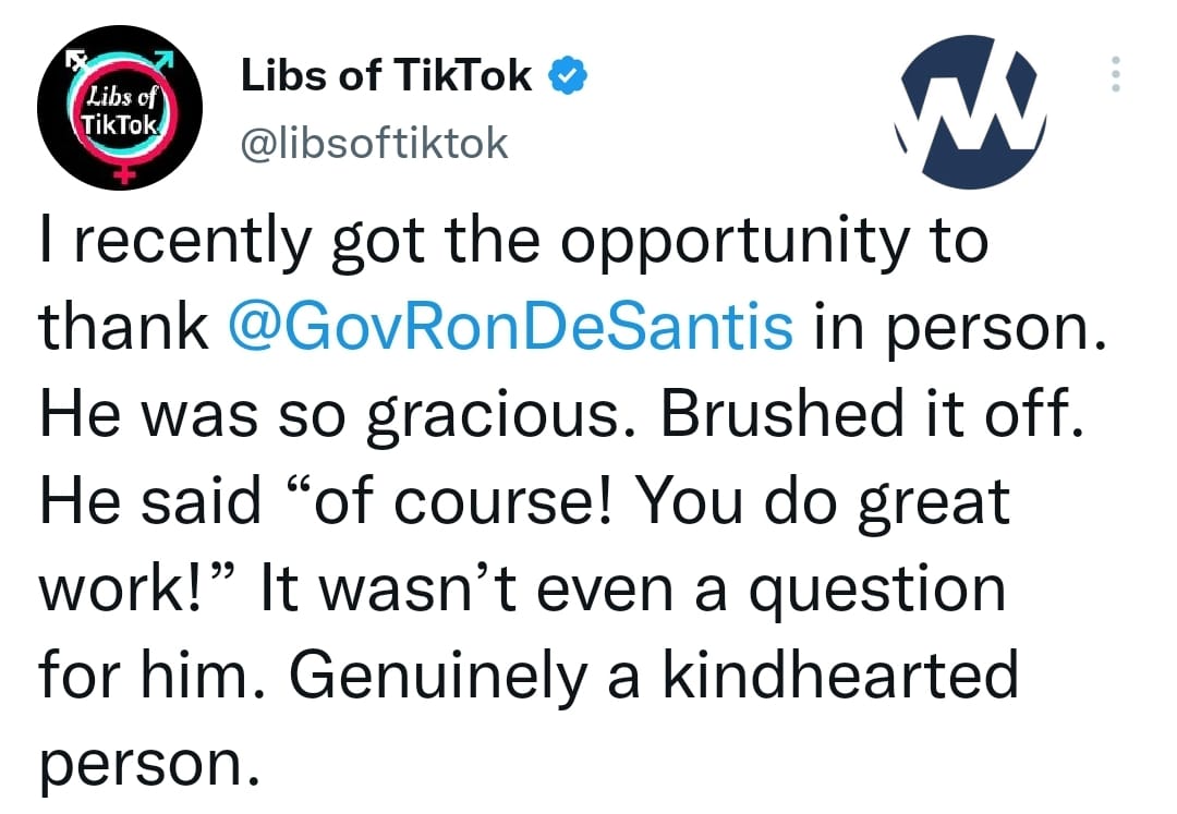 In a follow-up Twitter post, Raichik added, “I recently had the opportunity to thank @GovRonDeSantis in person. He was so gracious. Brushed it off. He said ‘Of course! You do great work!’ It wasn’t even a question for him. Genuinely a kindhearted person.”