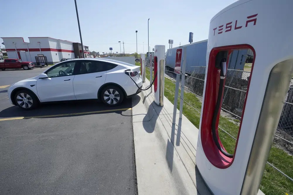 FILE - A Tesla charges at a station in Topeka, Kan., Monday, April 5, 2021. Tesla says it sold a record 1.3 million electric vehicles in 2022. But the number fell short of CEO Elon Musk’s pledge to grow the company's sales by 50% nearly every year. (AP Photo/Orlin Wagner, File)