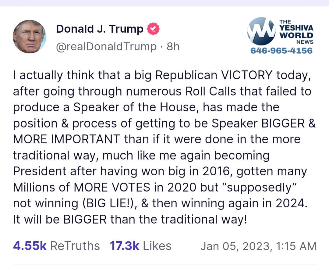 He then compared the chaos in the House to his 2024 bid for the White House, saying that it’s “much like me again becoming President after having won big in 2016, gotten many Millions of MORE VOTES in 2020 but “supposedly” not winning (BIG LIE!), & then winning again in 2024. It will be BIGGER than the traditional way!”