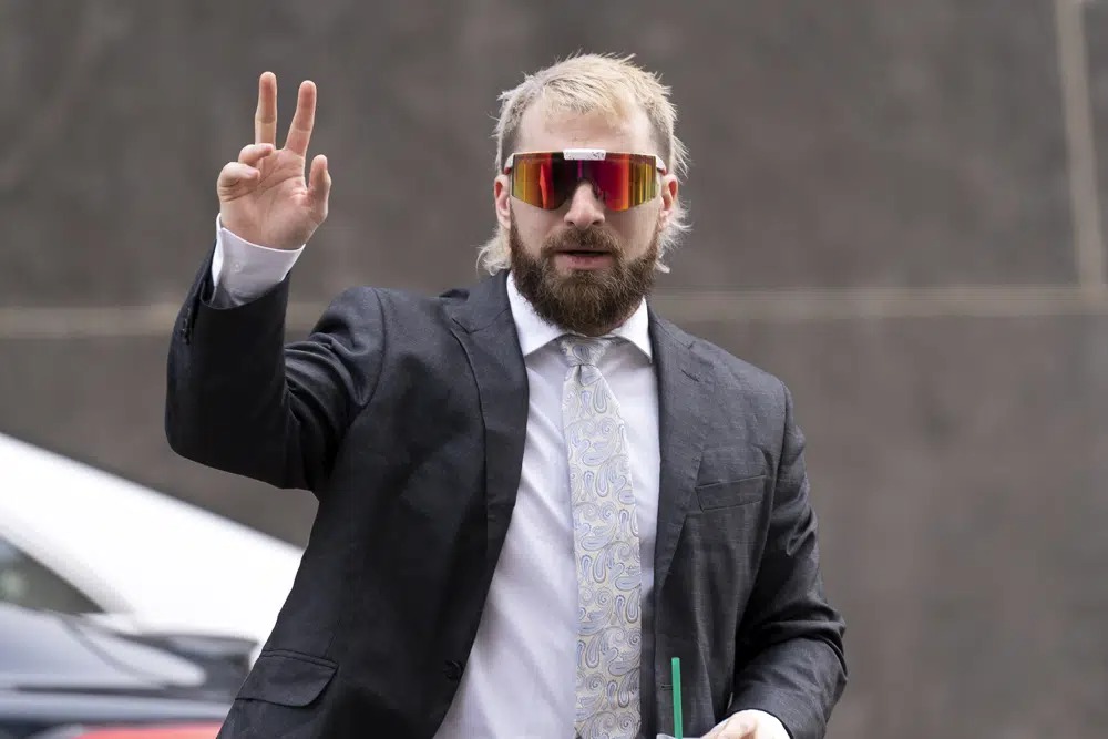 Anthime "Baked Alaska" Gionet, who livestreamed himself storming the U.S. Capitol in Jan. 6, arrives at federal court in Washington, Tuesday, Jan. 10, 2023. (AP Photo/Jose Luis Magana)