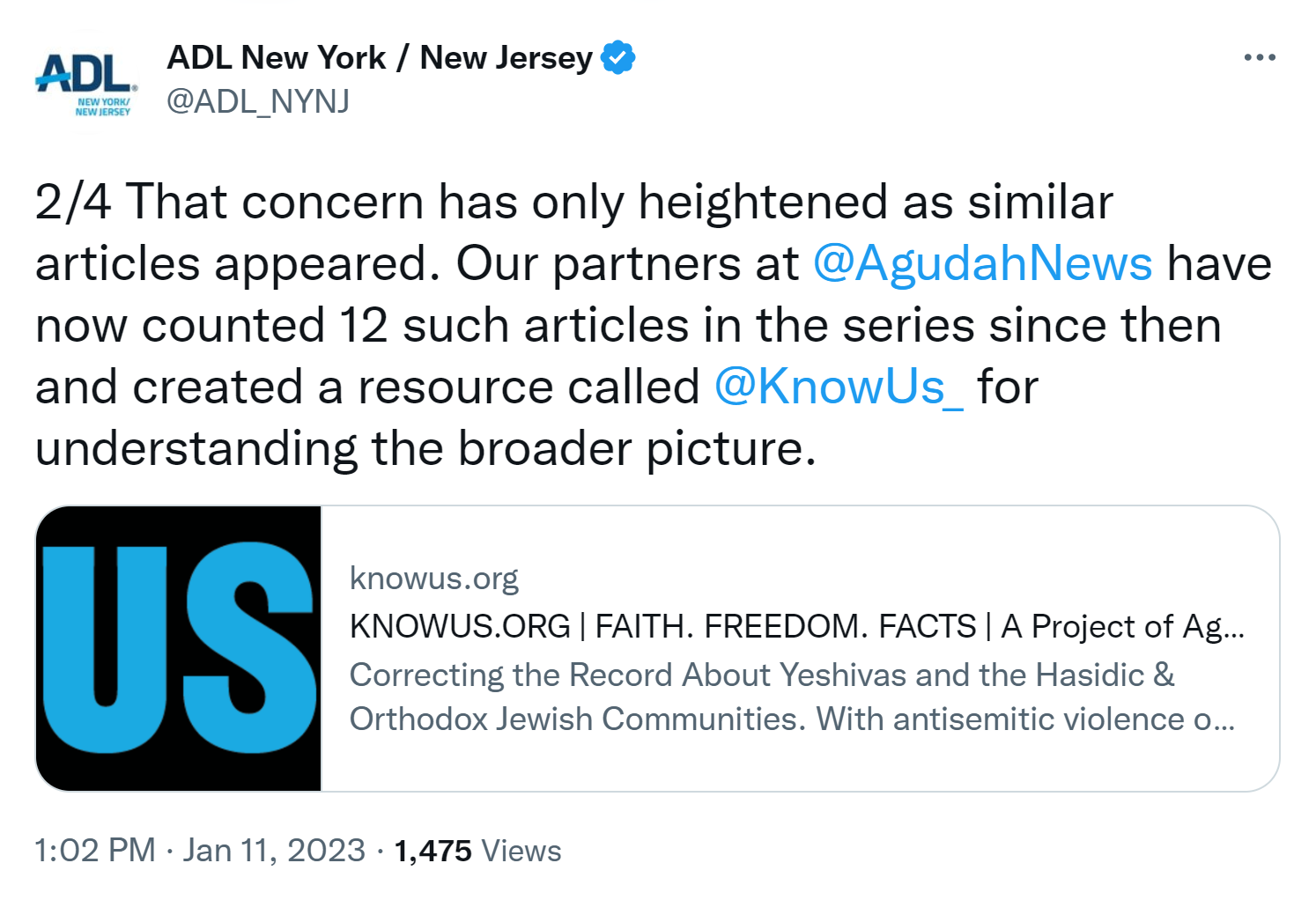 “That concern has only heightened as similar articles appeared,” the ADL continued its thread. “Our partners at @AgudahNews have now counted 12 such articles in the series since then and created a resource called @KnowUS_ for understanding the broader picture.”