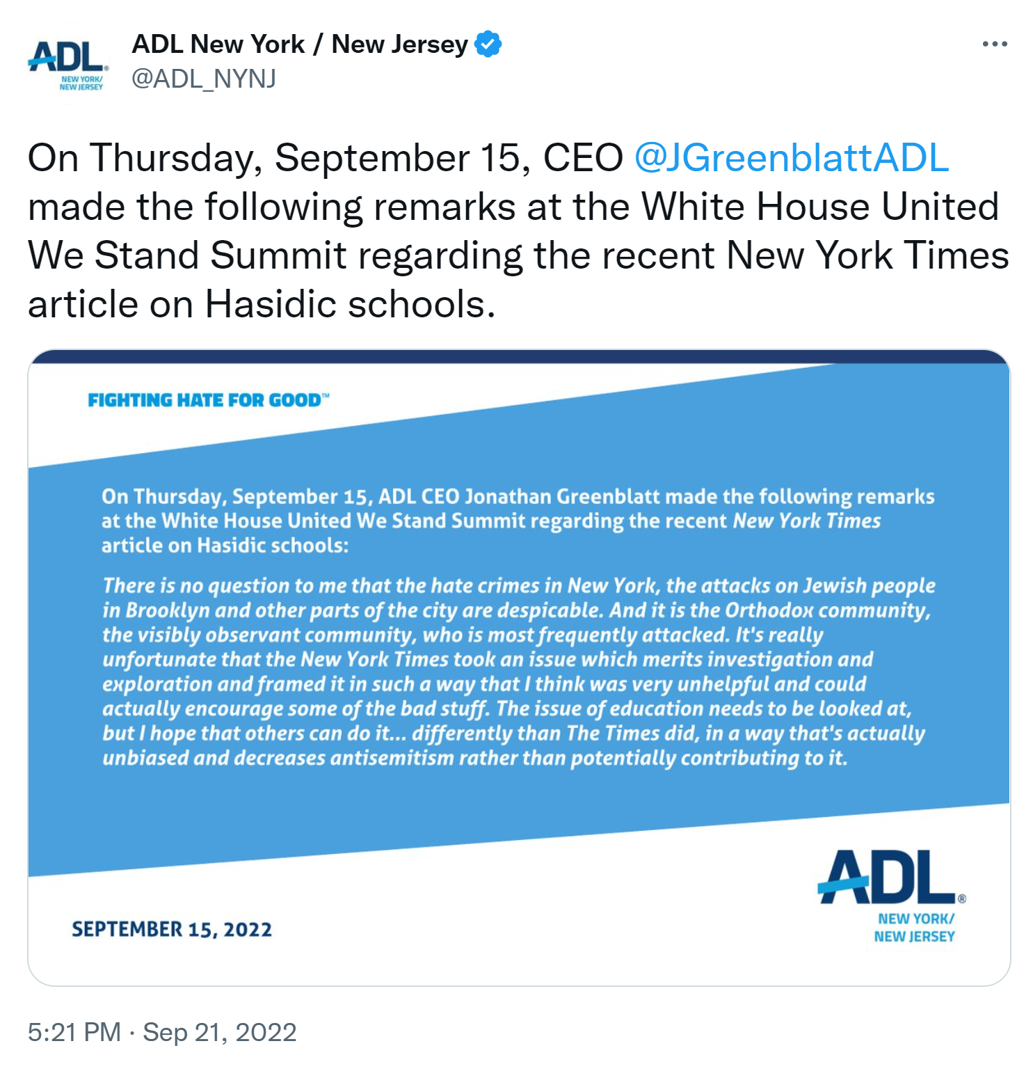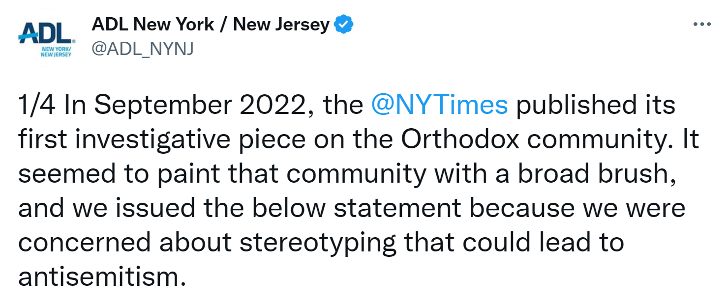 “In September 2022, the New York Times published its first investigative piece on the Orthodox Jewish community,” the ADL wrote in a four-part Twitter thread. “It seemed to paint that community with a broad brush, and we issued the below statement because we were concerned about stereotyping that could lead to antisemitism.”