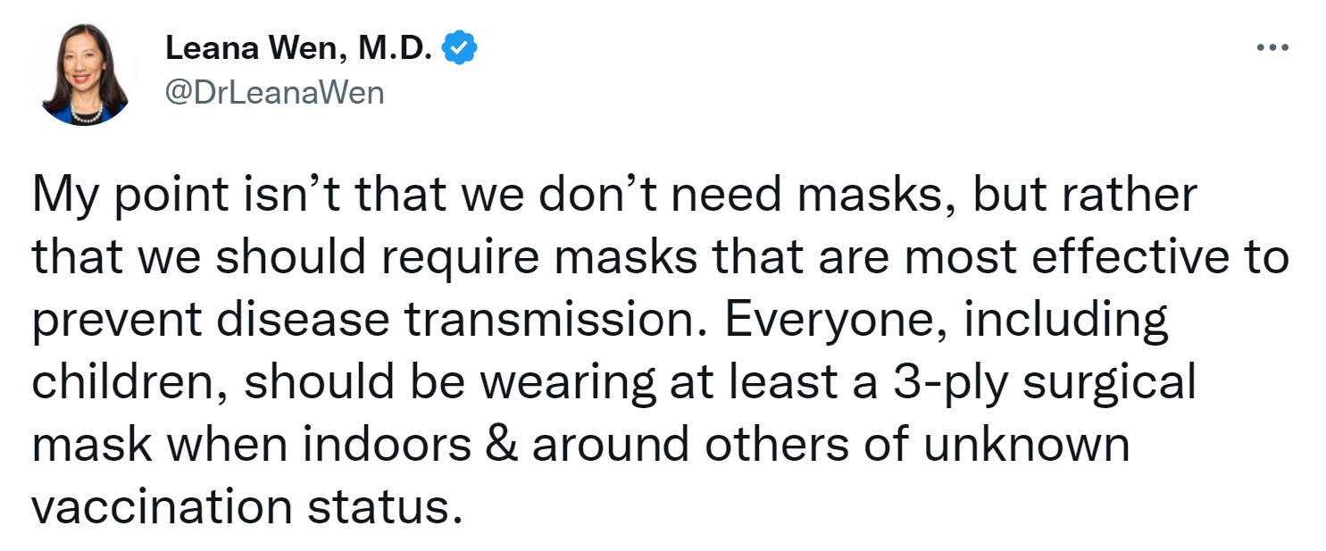 Wen’s change of tune is a 180-degree turn from what she long pushed for: tighter Covid measures, including wearing heavy-duty masks in public. Last December she insisted that “everyone, including children, should be wearing at least a 3-ply surgical mask when indoors & around others of unknown vaccination status.”