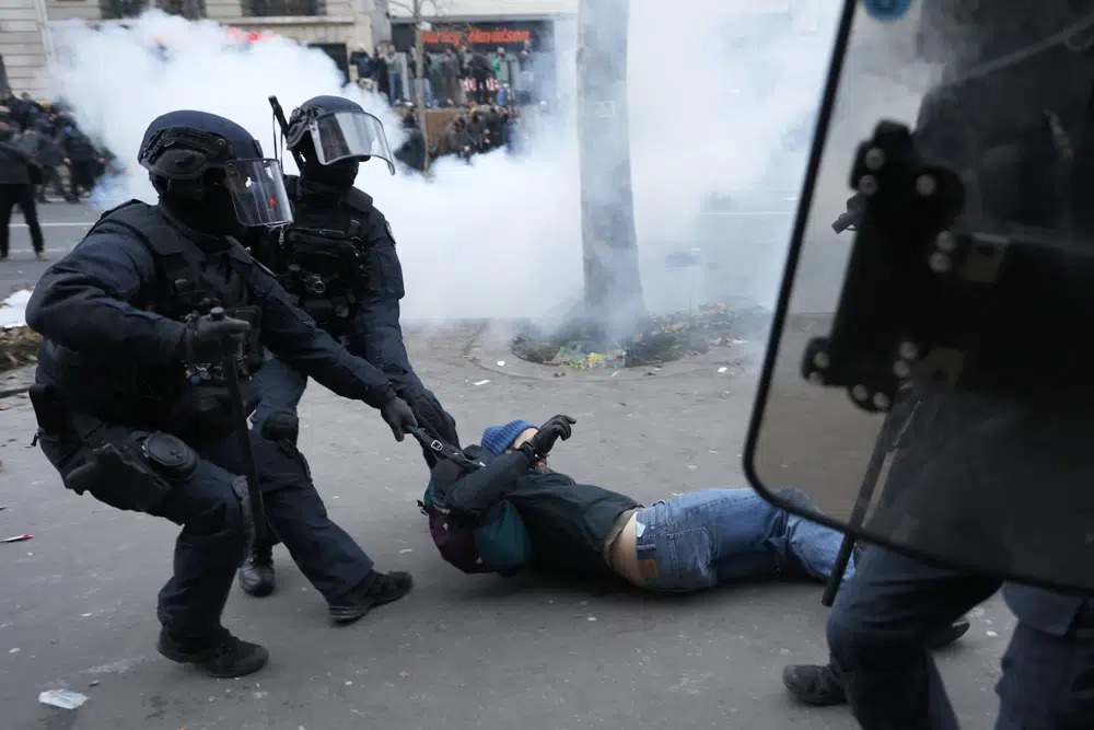 As Macron spoke, riot police pushed back against some protesters throwing projectiles on the sidelines of the largely peaceful Paris march. Some other minor incidents briefly flared up, leading officers to use tear gas.