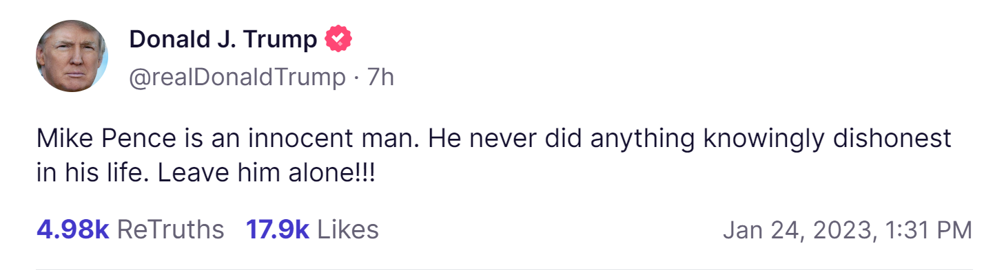 “Mike Pence is an innocent man,” Trump wrote. “He never did anything knowingly dishonest in his life. Leave him alone!!!”