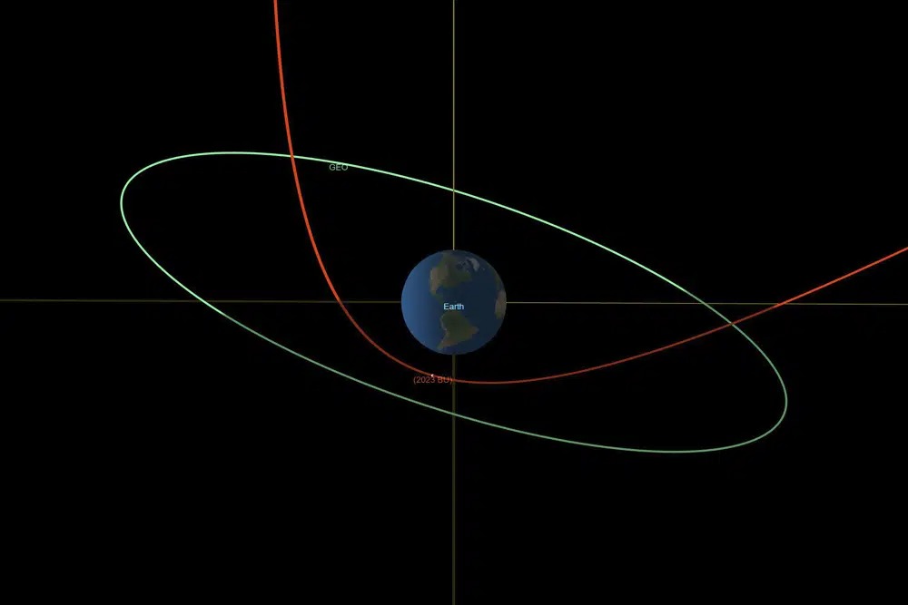 Discovered Saturday, the asteroid known as 2023 BU is believed to be between 11 feet (3.5 meters) and 28 feet (8.5 meters) feet across. It was first spotted by the same amateur astronomer in Crimea, Gennady Borisov, who discovered an interstellar comet in 2019. Within a few days, dozens of observations were made by astronomers around the world, allowing them to refine the asteroid’s orbit.
