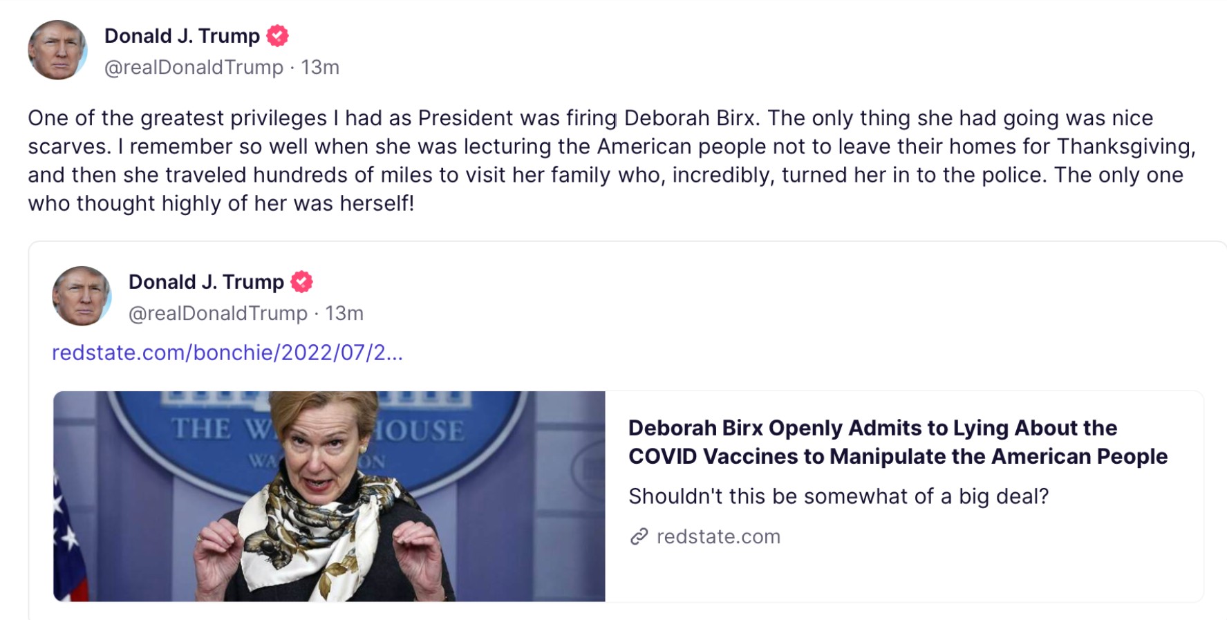 In an apparently random post on Truth Social, former President Donald Trump said it was a tremendous privilege to fire Dr. Deborah Birx, one of his top Covid advisers, adding that she had “nice scarves.”