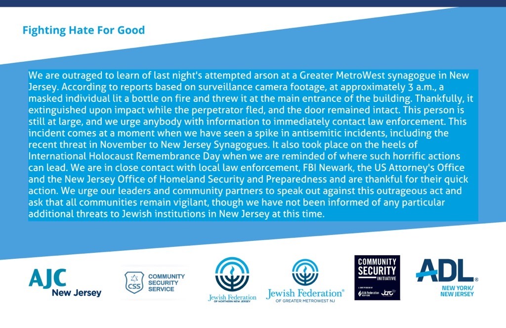 NJ Attorney General Matt Platkin said: “The Office of the Attorney General is aware of the attempted arson at a synagogue in Essex County that occurred in the early morning hours today. My office is working closely with local, county, state and federal law enforcement agencies, to identify and apprehend the suspect in this attack. Our investigation remains ongoing.