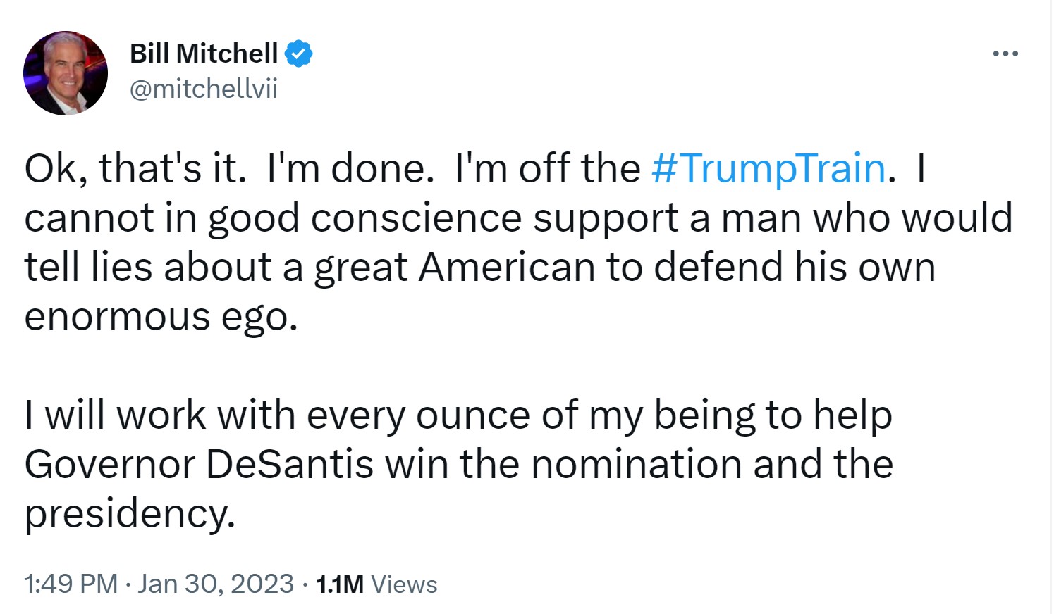 “Ok, that’s it. I’m done. I’m off the #TrumpTrain,” Mitchell wrote. “I cannot in good conscience support a man who would tell lies about a great American to defend his own enormous ego.”