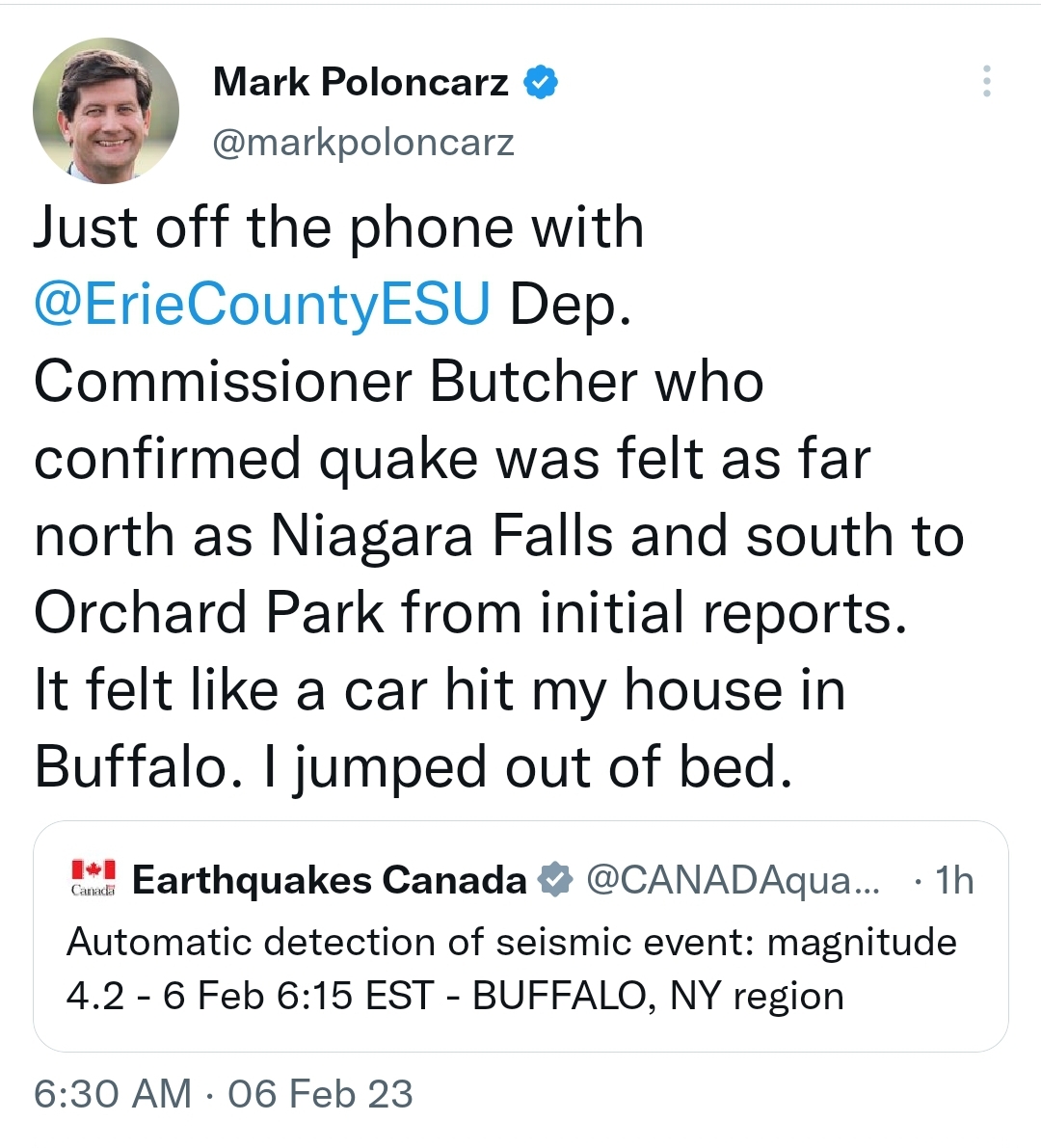 “It felt like a car hit my house in Buffalo. I jumped out of bed,” Erie County Executive Mark Poloncarz tweeted. County emergency services officials confirmed the earthquake was felt in at least a 30-mile radius, including in Niagara Falls, about 20 miles north of Buffalo, he said.