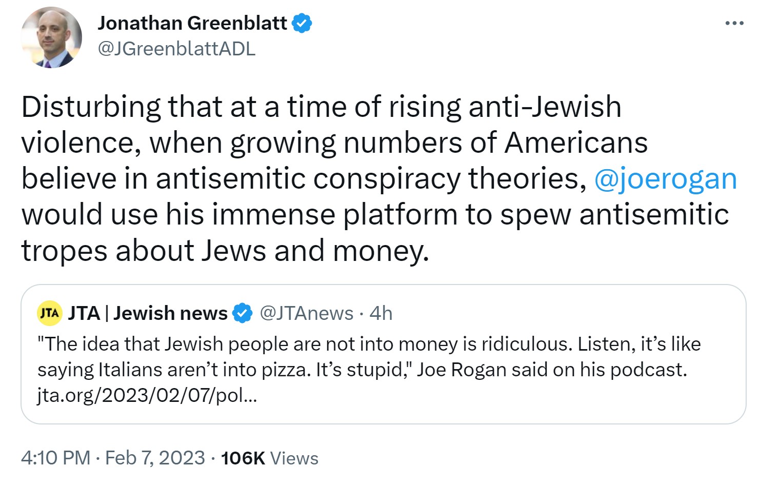 “Disturbing that at a time of rising anti-Jewish violence, when growing numbers of Americans believe in antisemitic conspiracy theories, @joerogan would use his immense platform to spew antisemitic tropes about Jews and money,” tweet ADL CEO Jason Greenblatt.
