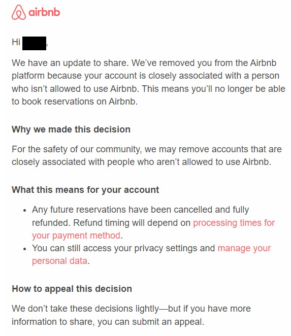 “We’ve removed you from the Airbnb platform because your account is closely associated with a person who isn’t allowed to use Airbnb. This means you’ll no longer be able to book reservations on Airbnb,” the message reads.