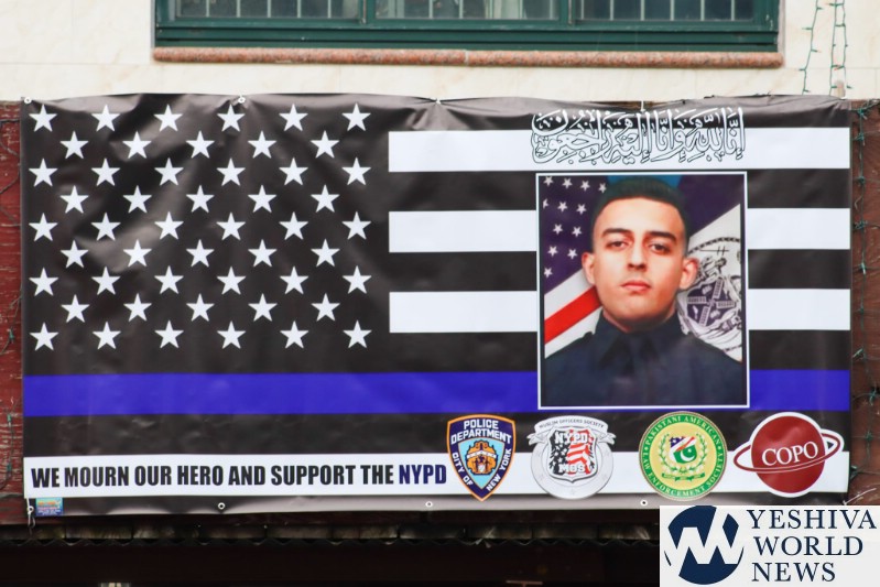 Adeed Fayaz, the 26-year-old NYPD officer who was shot and killed during a botched robbery on Saturday, was carried in a flag-draped coffin during a funeral procession on Thursday.