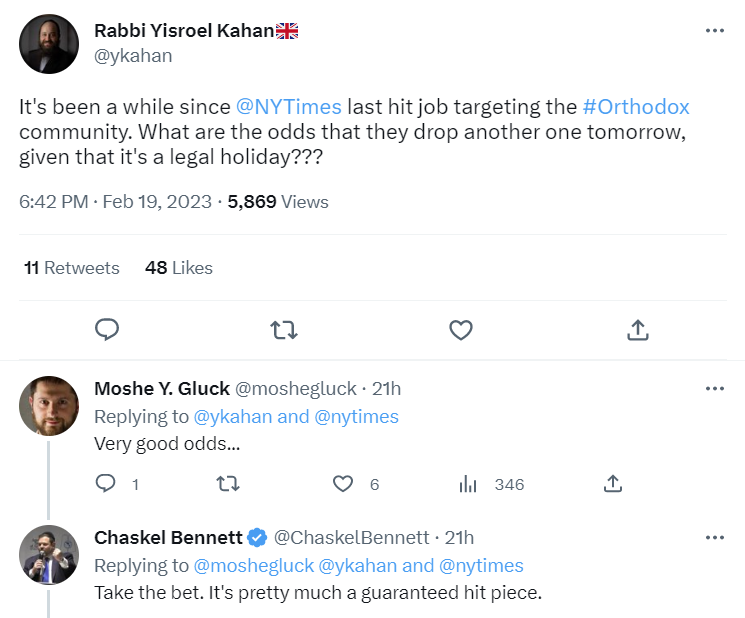 “It’s been a while since @NYTimes last hit piece targeting the #Orthodox community. What are the odds that they drop another one tomorrow, given that it’s a legal holiday???” he wrote on Twitter.