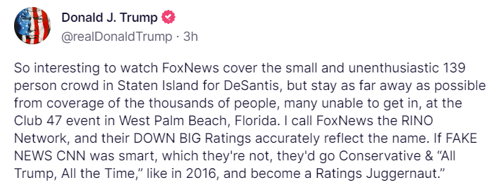 “So interesting to watch FoxNews cover the small and unenthusiastic 139 person crowd in Staten Island for DeSantis, but stay as far away as possible from coverage of the thousands of people, many unable to get in, at the Club 47 event in West Palm Beach, Florida. I call FoxNews the RINO Network, and their DOWN BIG Ratings accurately reflect the name. If FAKE NEWS CNN was smart, which they’re not, they’d go Conservative & “All Trump, All the Time,” like in 2016, and become a Ratings Juggernaut.””