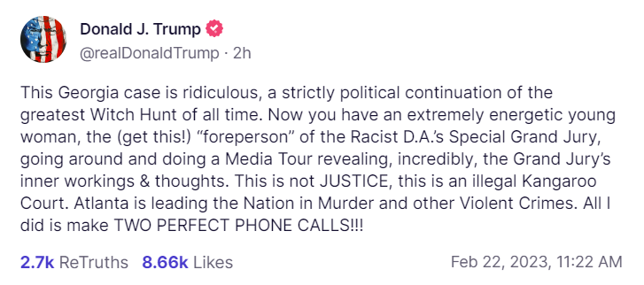 “This is not JUSTICE, this is an illegal Kangaroo Court,” Trump wrote. “Atlanta is leading the Nation in Murder and other Violent Crimes. All I did is make TWO PERFECT PHONE CALLS!!!”