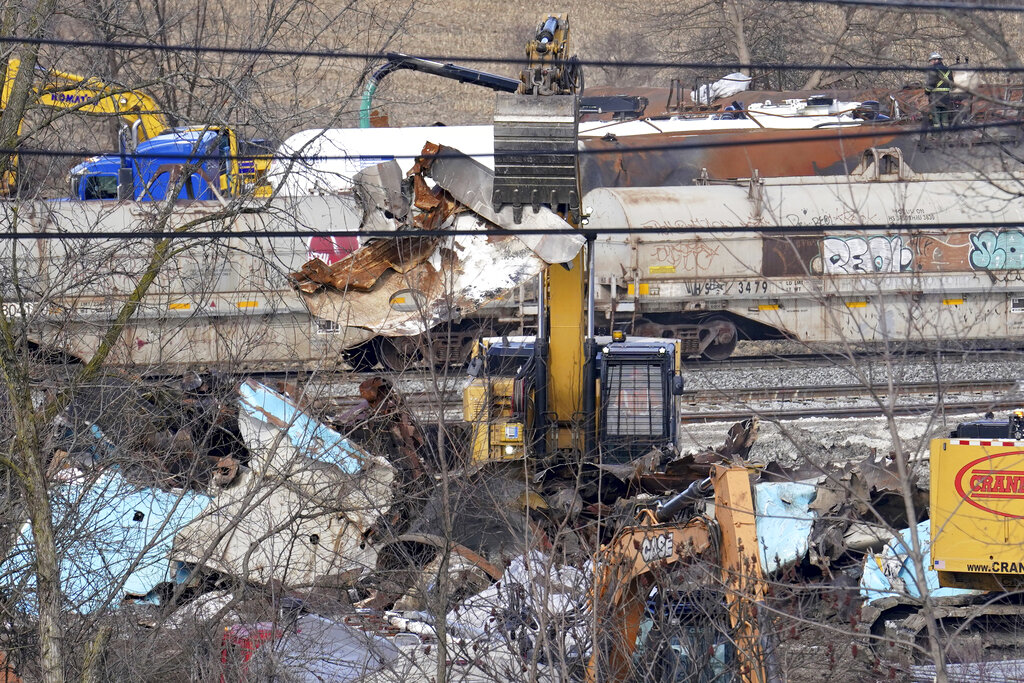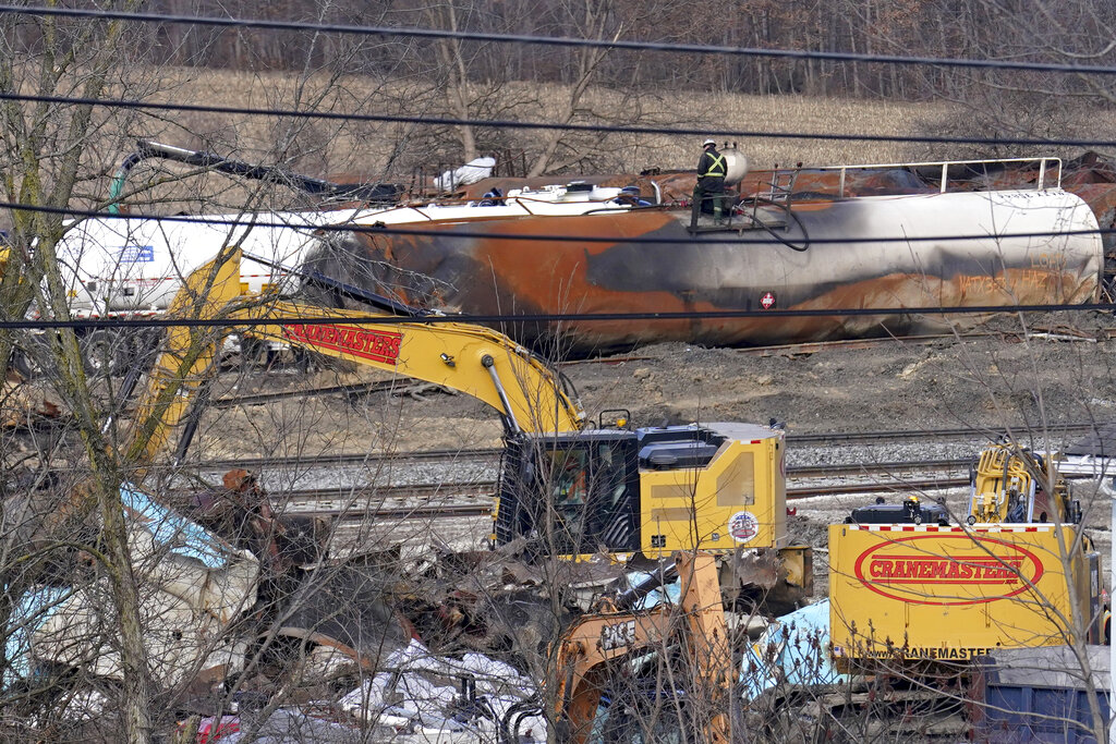 Before Trump’s arrival, excavators picked up charred chunks of the rail cars that have been piled alongside the tracks and scooped up contaminated soil. Trucks were hauling contaminated water to a makeshift “tank farm,” where it is being stored in metal containers before being taken to a hazardous waste site.