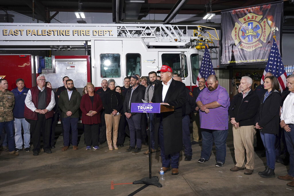 Trump, wearing his trademark red “Make America Great Again” cap and an overcoat, said the community needs “answers and results,” not excuses. He spoke at a firehouse roughly half a mile from where more than three dozen freight cars — including 11 carrying hazardous materials — came off the tracks near the Pennsylvania state line.
