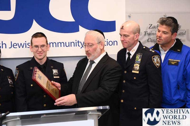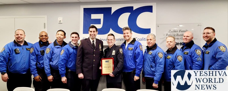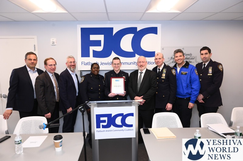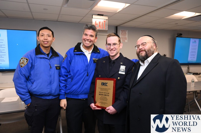 Mayor Eric Adams and the FJCC honored police officers Meir Green and Jessica Morgan-Brown of the 76 precinct for their bravery in the line of duty. They rescued a transit rider who fell on the tracks in a video that went viral. The Mayoral award was presented by Senior Advisor to the Mayor Joel Eisdorfer and Commissioner of the Community Affairs Unit, Fred Kreizman.