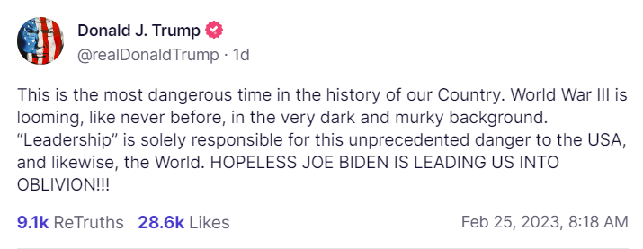 “World War III is looming, like never before, in the very dark and murky background. ‘Leadership’ is solely responsible for this unprecedented danger to the USA, and likewise, the World. HOPELESS JOE BIDEN IS LEADING US INTO OBLIVION!!!” Trump wrote on Truth Social.