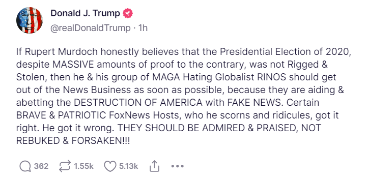 “If Rupert Murdoch honestly believes that the Presidential Election of 2020, despite MASSIVE amounts of proof to the contrary, was not Rigged & Stollen, then he & his group of MAGA Hating Globalist RINOS should get out of the News Business as soon as possible, because they are aiding & abetting the DESTRUCTION OF AMERICA with FAKE NEWS. Certain BRAVE & PATRIOTIC FoxNews Hosts, who he scorns and ridicules, got it right. He got it wrong. THEY SHOULD BE ADMIRED & PRAISED, NOT REBUKED & FORSAKEN!!!” Trump wrote on Truth Social.