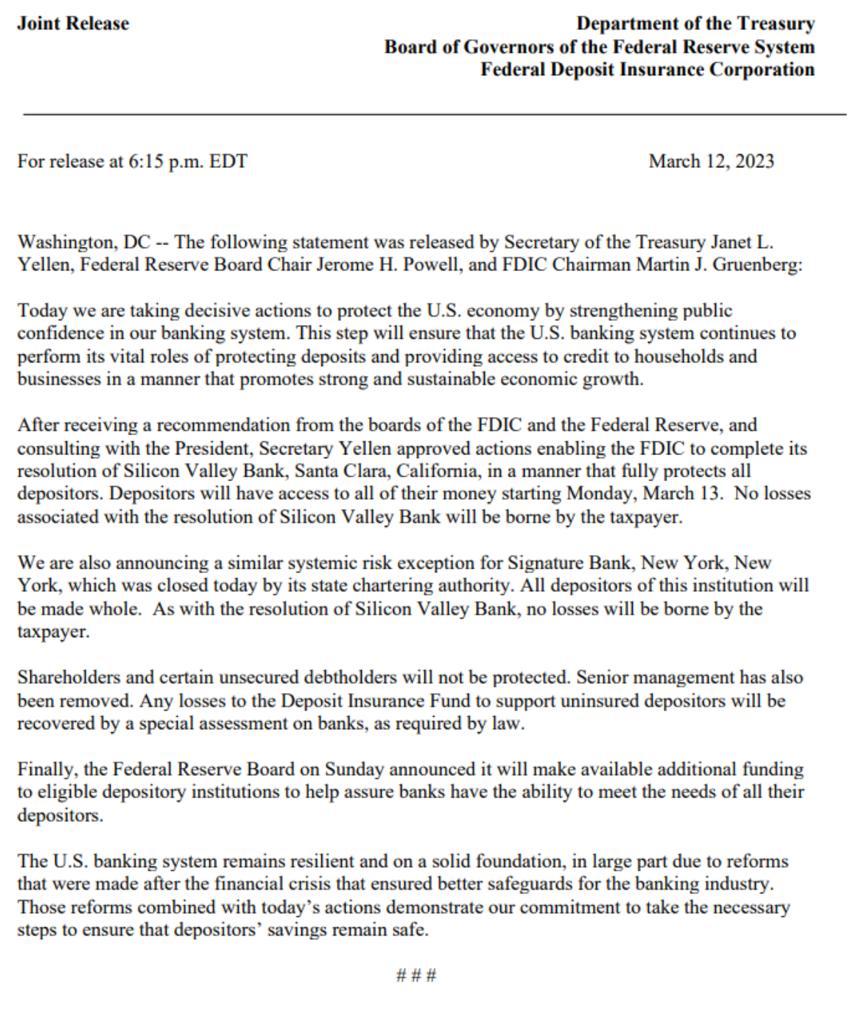 “We are also announcing a similar systemic risk exception for Signature Bank, New York, New York, which was closed today by its state chartering authority,” Treasury, Federal Reserve, and FDIC said in a joined statement Sunday evening.