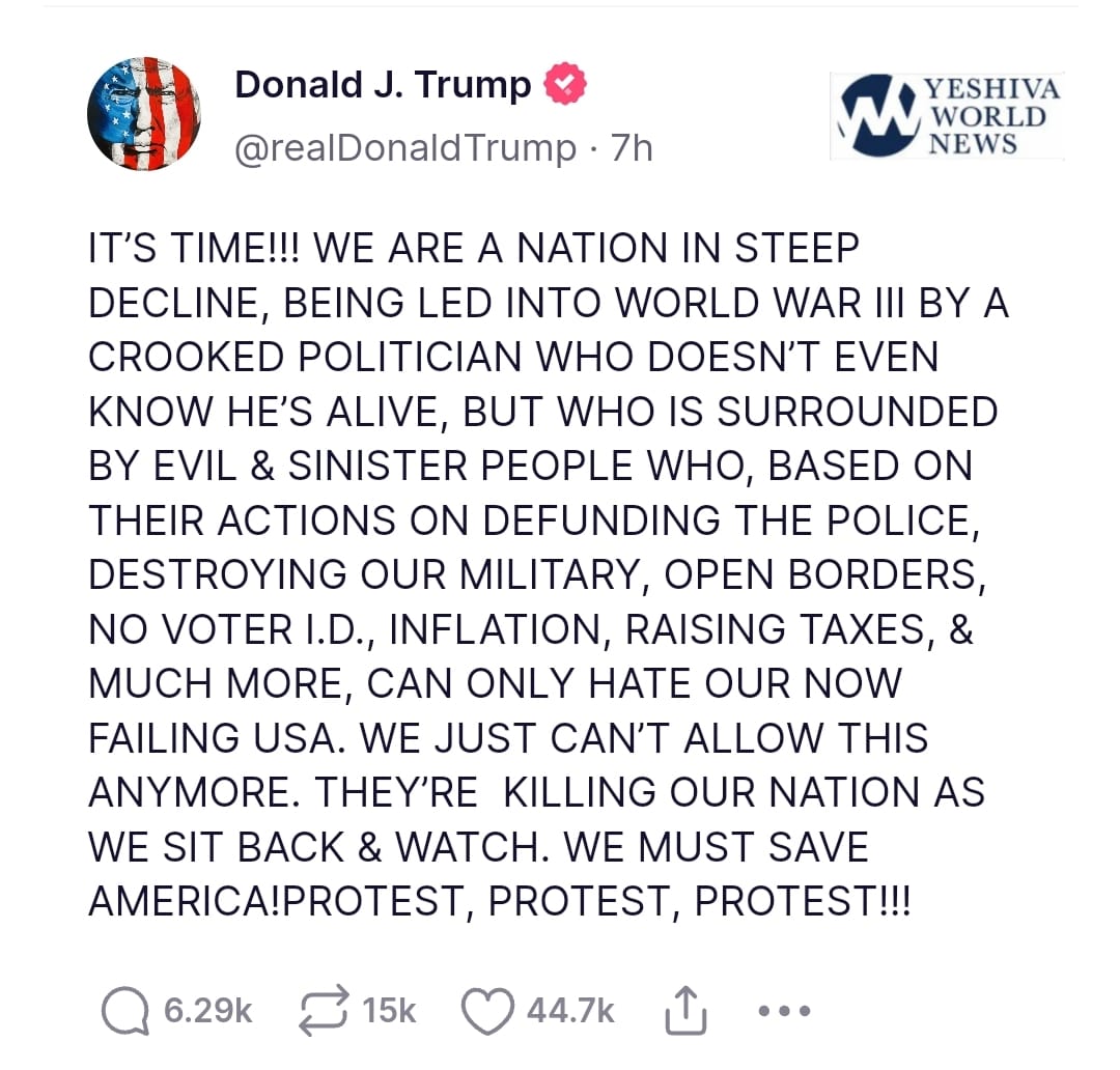 In a later post that went beyond simply exhorting loyalists to protest about his legal peril, the 2024 presidential candidate directed his overarching ire in all capital letters at the Biden administration and raised the prospect of civil unrest: “IT’S TIME!!!” he wrote. “WE JUST CAN’T ALLOW THIS ANYMORE. THEY’RE KILLING OUR NATION AS WE SIT BACK & WATCH. WE MUST SAVE AMERICA!PROTEST, PROTEST, PROTEST!!!”
