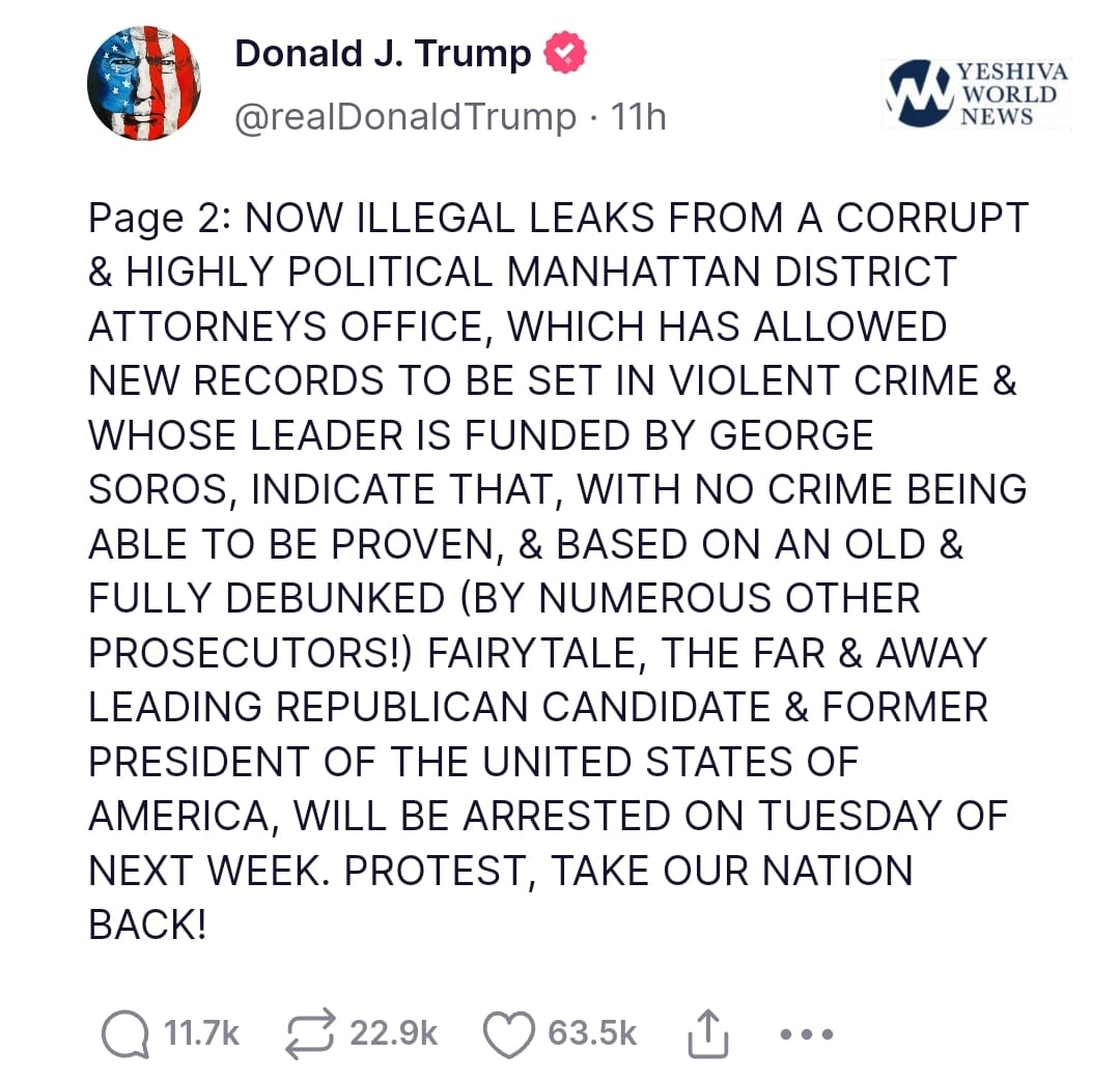 That did not stop Trump from taking to his social media platform to say “illegal leaks” from Bragg’s office indicate that “THE FAR & AWAY LEADING REPUBLICAN CANDIDATE & FORMER PRESIDENT OF THE UNITED STATES OF AMERICA, WILL BE ARRESTED ON TUESDAY OF NEXT WEEK.”