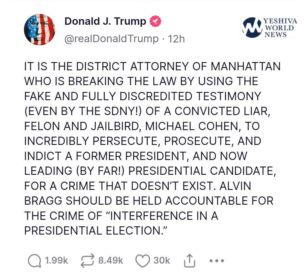 “ALVIN BRAGG SHOULD BE HELD ACCOUNTABLE FOR THE CRIME OF “INTERFERENCE IN A PRESIDENTIAL ELECTION,” Trump wrote late Sunday on his social media site.