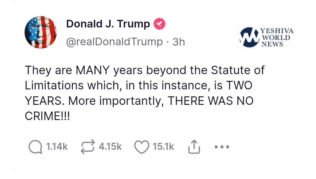 Trump claimed Monday that the statute of limitations has expired on his case, an assertion that legal experts reject. “More importantly, THERE WAS NO CRIME!!!” Trump added.