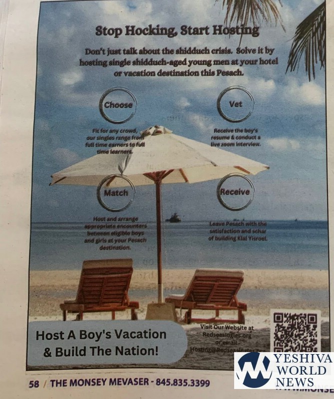 For those who may not be aware, the idea is that Pesach programs should host eligible young men free of charge on the condition that they are there to date. This idea is supposedly aimed at “solving the shidduch crisis.” Yet, it is clear to anyone who has thought about this for more than five seconds that whoever came up with this idea is more likely to be a bored yeshiva guy in need of a free vacation than a well-intentioned problem solver.